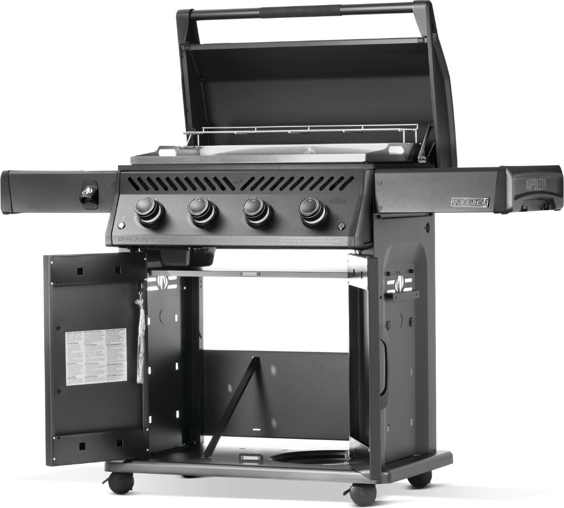 The Rogue® PRO Phantom 30 Inch Rust-Resistant Griddle is the ultimate outdoor cooking companion, combining durability, versatility, and convenience. Featuring a 430 stainless steel cooktop, four high-performance burners delivering up to 33,600 BTUs, and edge-to-edge even heat distribution. The integrated side shelf with removable caddy and prep station lid keeps your tools and ingredients organized, while the folding shelves with built-in hooks offer additional storage. With a dual-pivot lid for cooktop protection, an ergonomic front-access grease tray, white backlit knobs, 4 locking caster wheels and a convenient bottle opener. This griddle cart is designed for long-lasting performance and effortless grilling.