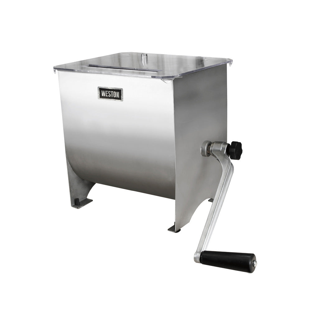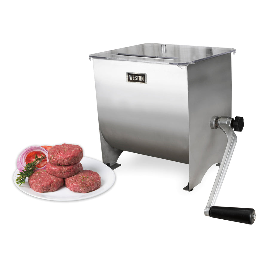 Le mélangeur à viande en acier inoxydable Weston® est idéal pour bien mélanger la viande hachée et les assaisonnements en vrac. Il est idéal pour préparer vos propres hamburgers, saucisses et viande séchée à partir de bœuf, de porc, de bison, de chevreuil, de poulet, de dinde et d'autres viandes. Il suffit de mettre les assaisonnements, l'eau et la viande hachée dans la trémie et de tourner la poignée robuste en aluminium pour mélanger les ingrédients en quelques minutes. La grande trémie peut contenir jusqu'à 20 lb de viande hachée. Il est facile de vérifier la progression du mélange grâce au couvercle en plastique transparent ou d'ajouter des assaisonnements à l'aide de la fente d'assaisonnement sans s'arrêter pour soulever le couvercle. Les pieds recouverts de caoutchouc sont réglables et aident à éviter les glissements. Ils protègent également les comptoirs et autres surfaces de travail sur lesquelles vous mélangez la viande. Le mélangeur à viande est facile à assembler et à démonter pour le nettoyage. Les palettes de mélange en acier inoxydable sont faciles à retirer pour un nettoyage rapide dans l'évier.